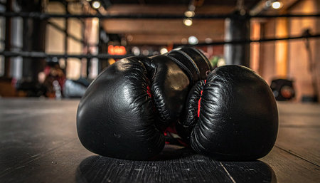 This image features a close-up of sleek black boxing gloves resting against a dark backdrop, perfect for illustrating themes of sports, fitness, and determination.
