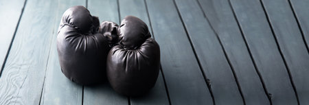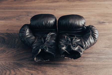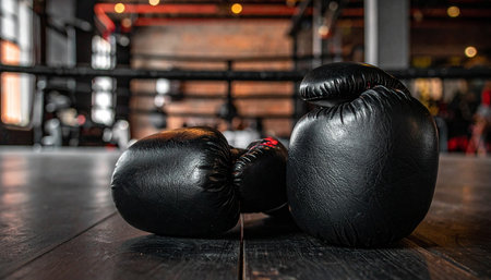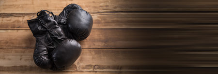 Pair of black boxing gloves on a wooden floor in a gym