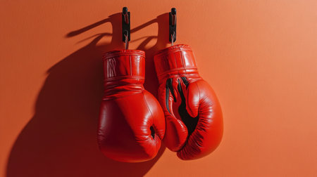 This striking image showcases a pair of vibrant red boxing gloves hanging against an eye-catching orange background, perfect for sport and fitness themes.