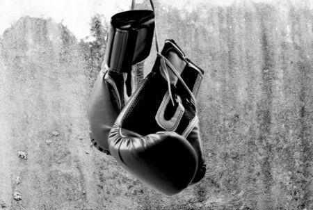 Boxing gloves hanging on wall low key gray background with copy space