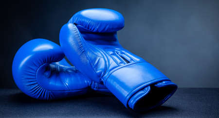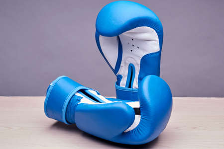 A pair of leather Boxing gloves on a blue background, free space. The concept of fighting and fighting with difficulties.