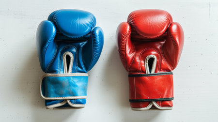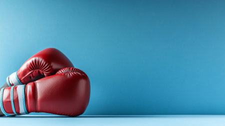 Pair of red boxing gloves lying on a minimalist blue background