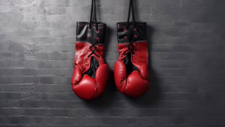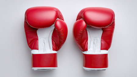 Vibrant red boxing gloves positioned on a gray background, ideal for sports or fitness advertising, representing training, competition, and athleticism.