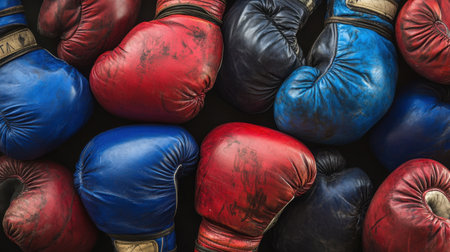 A striking close-up of colorful and worn boxing gloves arranged on a black background, showcasing their texture and character, perfect for sports-related themes.