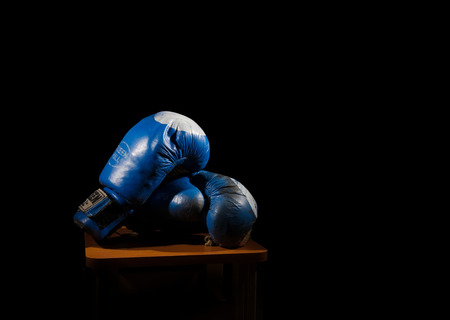 Old boxing gloves lie on a stool on a black background.