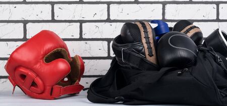 boxing bag with training equipment lies next to the red protective helmet