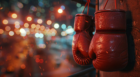 Two worn, red boxing gloves hang from a dark wall, illuminated by a single light source, creating dramatic shadows and highlighting the texture of the leather.