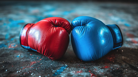 Red and blue boxing gloves on white background. Concept of political confrontation between American major parties
