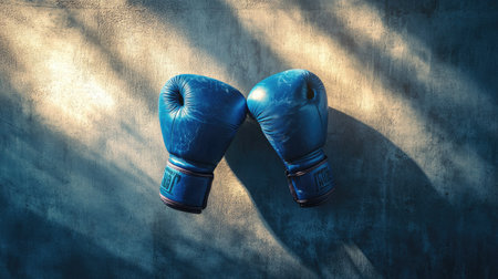 Pair of blue boxing gloves swinging slightly on a gym wall with dramatic lighting and shadows