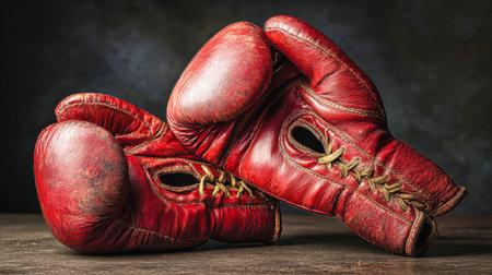 Red leather, old boxing gloves on a dark background.