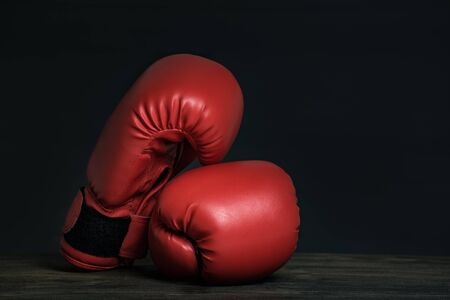 Pair of red boxing gloves on a black background. Copy space
