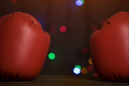 Pair of red boxing gloves, festive garland on background. Close up