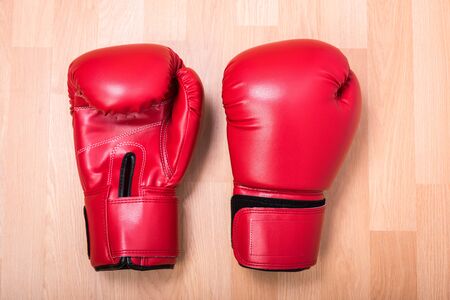 Two red boxing gloves on wooden table