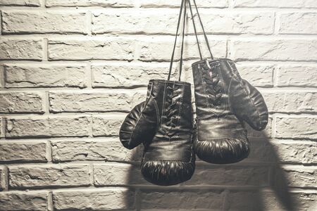 Pair of black leather boxing gloves hanging on a white brick wall