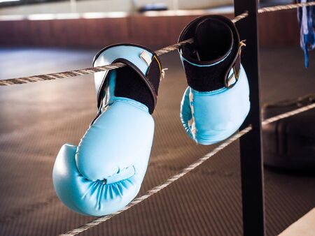 Blue boxing gloves hanging on the boxing ring
