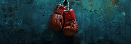 Red boxing gloves hanging on a blue wall. Banner. Textured background with copy space. Minimalistic sports equipment concept. Design for poster, banner, sport-related advertising. Copy space