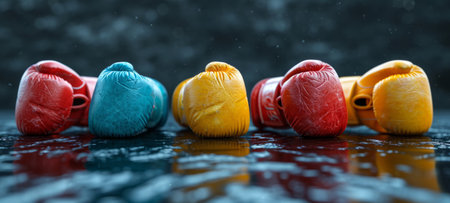 A colorful boxing gloves in row on a reflective surface with water droplets. Concept of strength and diversity in training, the intensity of boxing, and the element of water in sports.