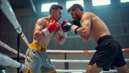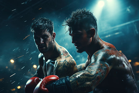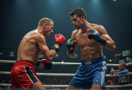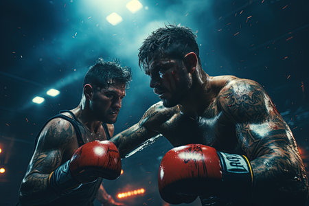 Boxing: Two fighters exchange blows in the center of a boxing ring, under the spotlight's glare. Generated with AI