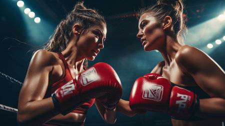 An AI illustration of An AI illustration of Two young women wearing boxing gloves, standing in a dark boxing ring, and engaging in a fun and competiti