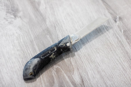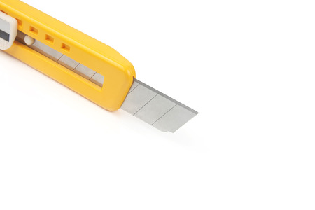 Bright yellow clerical sliding knife with a sharp blade in a carpentry workshop on a table