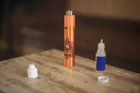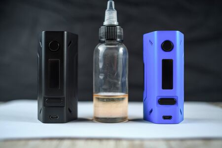 Vape. The electronic cigarette, a jar with the flavor and the liquid for vaping are standing on a table for background.