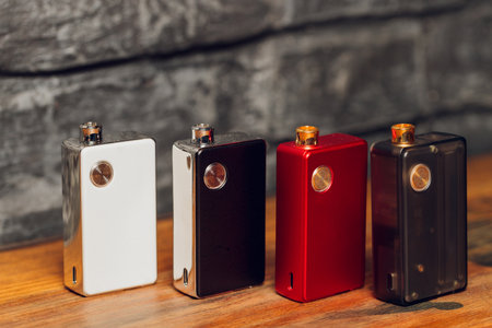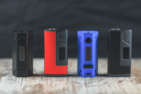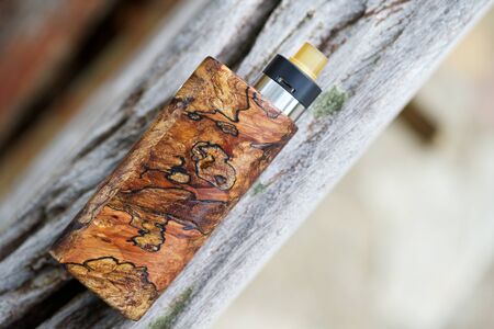 Vaping pen, vape devices, mods for electronic cigarette or e cigarette, e cig, on a wooden background.