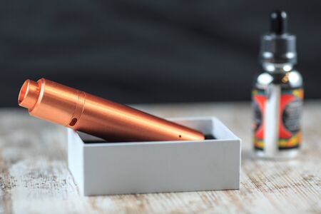 Electronic cigarette in white box and a bottle with fluid. Mechanical mod.