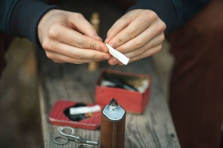 Vape. Male hands prepare cotton for an electronic cigarette. Close up.