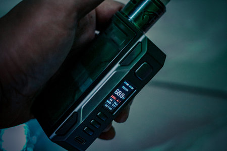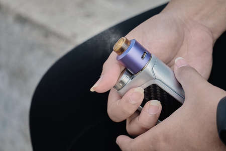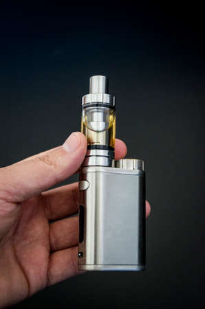 Vaping device in in the man's hand. Electronic cigarette, vape. Mini box mod, tank atomizer.