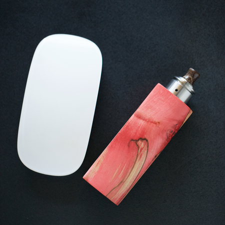 high end red and natural spalted stabilized wood box mods with rebuildable dripping atomizer beside wireless mouse on dark grey texture background, vape, vaping device, selective focus