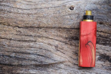 high end red natural stabilized wood regulated box mods with rebuildable dripping atomizer on natural timber wood texture background, vaporizer equipment, selective focus