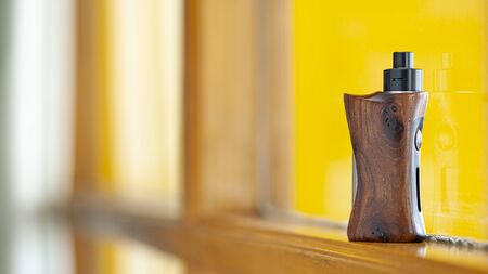 high end titanium genesis atomizer with stabilized natural black ash wood regulated box mods in yellow texture background, vaping device, selective focus