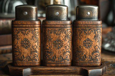 Three designer gasoline cigar lighters stand on a stand on the table.
