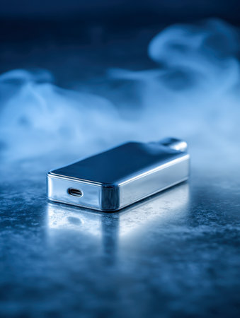 A contemporary metallic device with a usb-c port sits atop a glossy surface, enveloped in luminous blue haze that highlights its minimalist elegance and cutting-edge