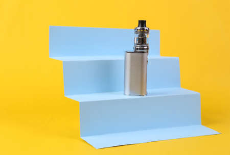 Vaping device on stairs, yellow background. Concept art, minimalism