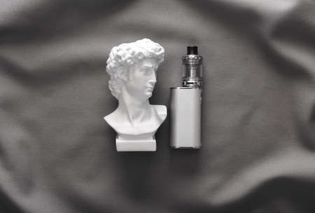 David plaster bust with electronic vape devicon gray crumpled silk background