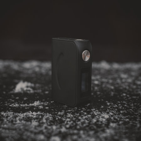 high end rebuildable dripping atomizer with black regulated box mods on black texture background, vaping device, selective focus with shallow depth of field