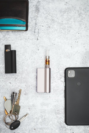 An every day carry flat lay with a cannabis vape cartridge and electronic cigarette.
