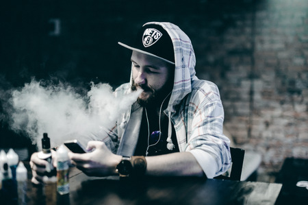 young man with beard in light checkered jacket with hood in a cap smokes an electronic cigarette and listens to music from phone in vape bar