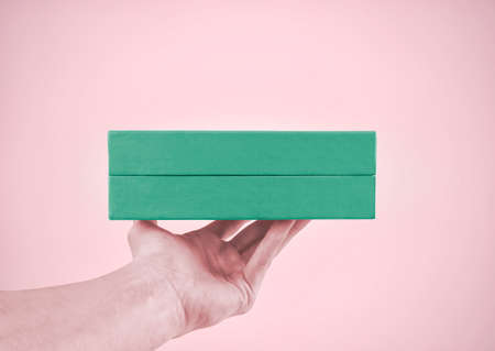 Gift box in male hand. Pastel colors. Gift giving cocept.