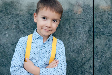 Close-up boy, future businessman, wearing yellow suspenders, dark blue pants and blue shirt against a green terracotta wall, with crossed arms and legs looking to camera, copy space.