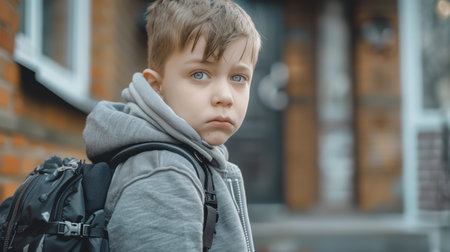Young Child With Backpack Looking Thoughtfully While Standing Outside a Brick House in a Quiet Neighborhood