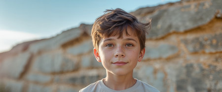 AI Generated. A young boy standing in front of a rock wall
