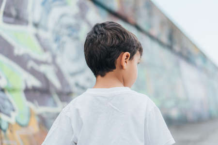back view of child in white-t-shirt standing outside