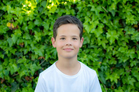 Pretty little boy in white shirt on green leaves background