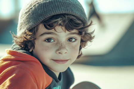 A young boy stands confidently with striking features against a colorful backdrop.