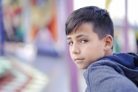 Portrait head shot of sad young boy child looking at camera