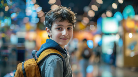 The picture of the middle eastern male child is traveling to the science museum or exhibition with curiosity to learning for education and research for the scientific information exploration. AIG43.