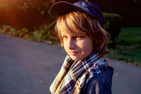 Handsome portrait of a young teenage guy on a sunny day. Summer walks. Blurred background.