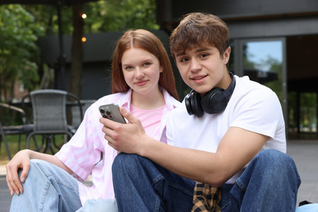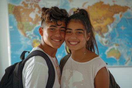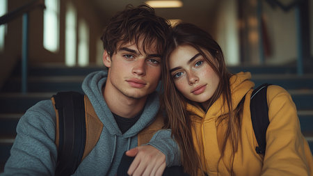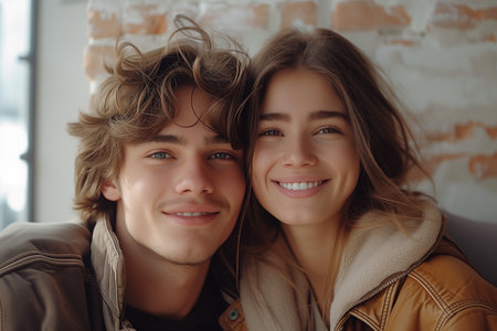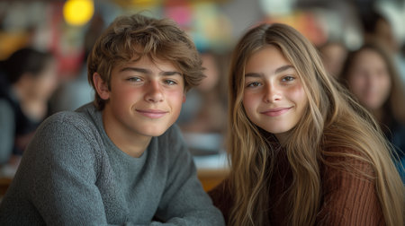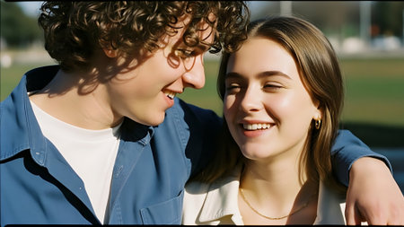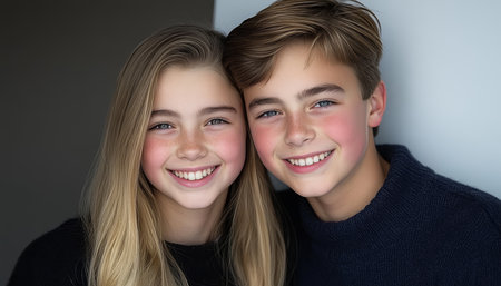 A closeup of two teenagers exchanging shy smile, showcasing youthful innocence and connection. their expressions reflect moment of shared joy and curiosity